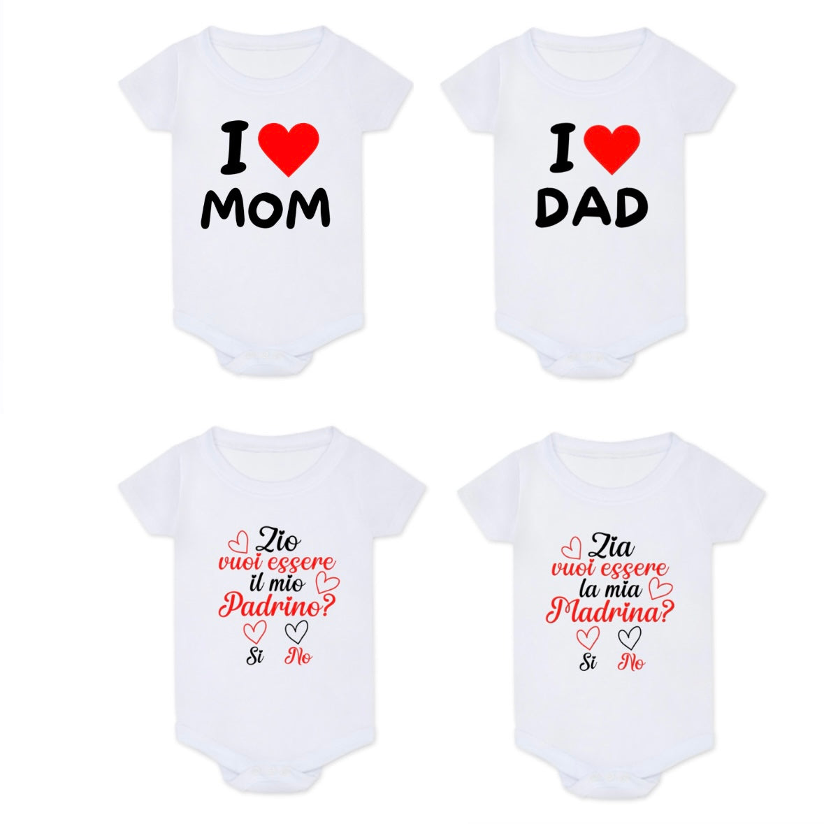 Body Bianco in Cotone con Stampa I Love Mom, I Love Dad, vuoi essere La Mia Madrina, vuoi essere Il Mio Padrino.